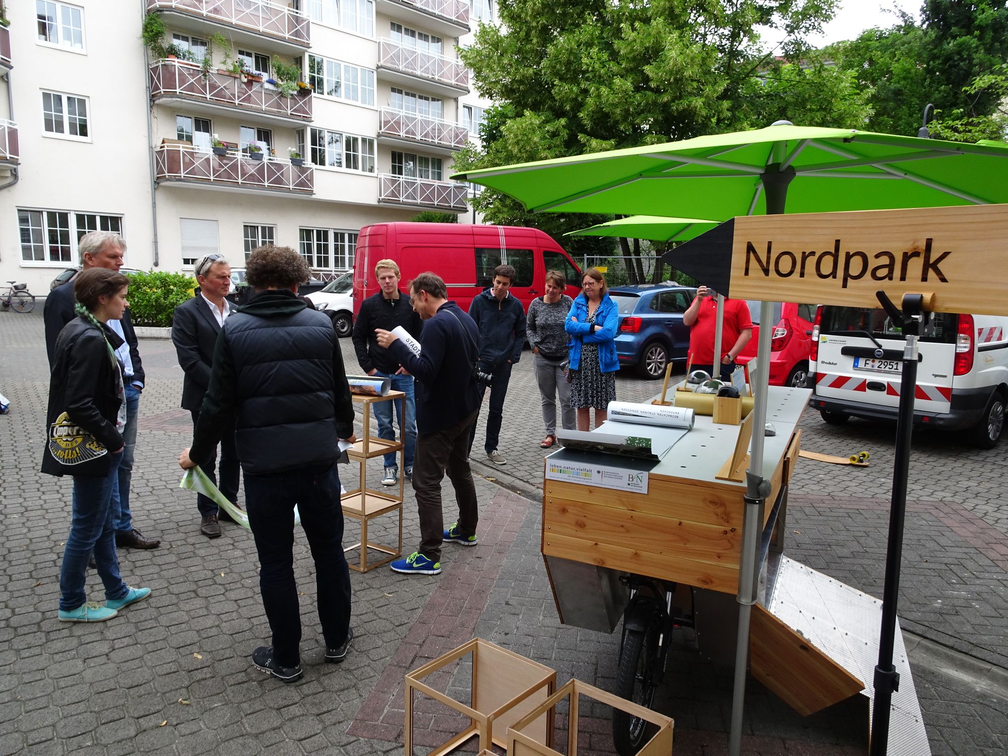 Etliche KollegInnen des Umweltamts verbringen daher ihre Mittagspause zur Einweihung im Innenhof, um interessiert der Transformation des WildnisWagens in einen Infostand beizuwohnen – aus den Fächern des Aufbaus kann nämlich so Einiges hervorgezaubert werden: